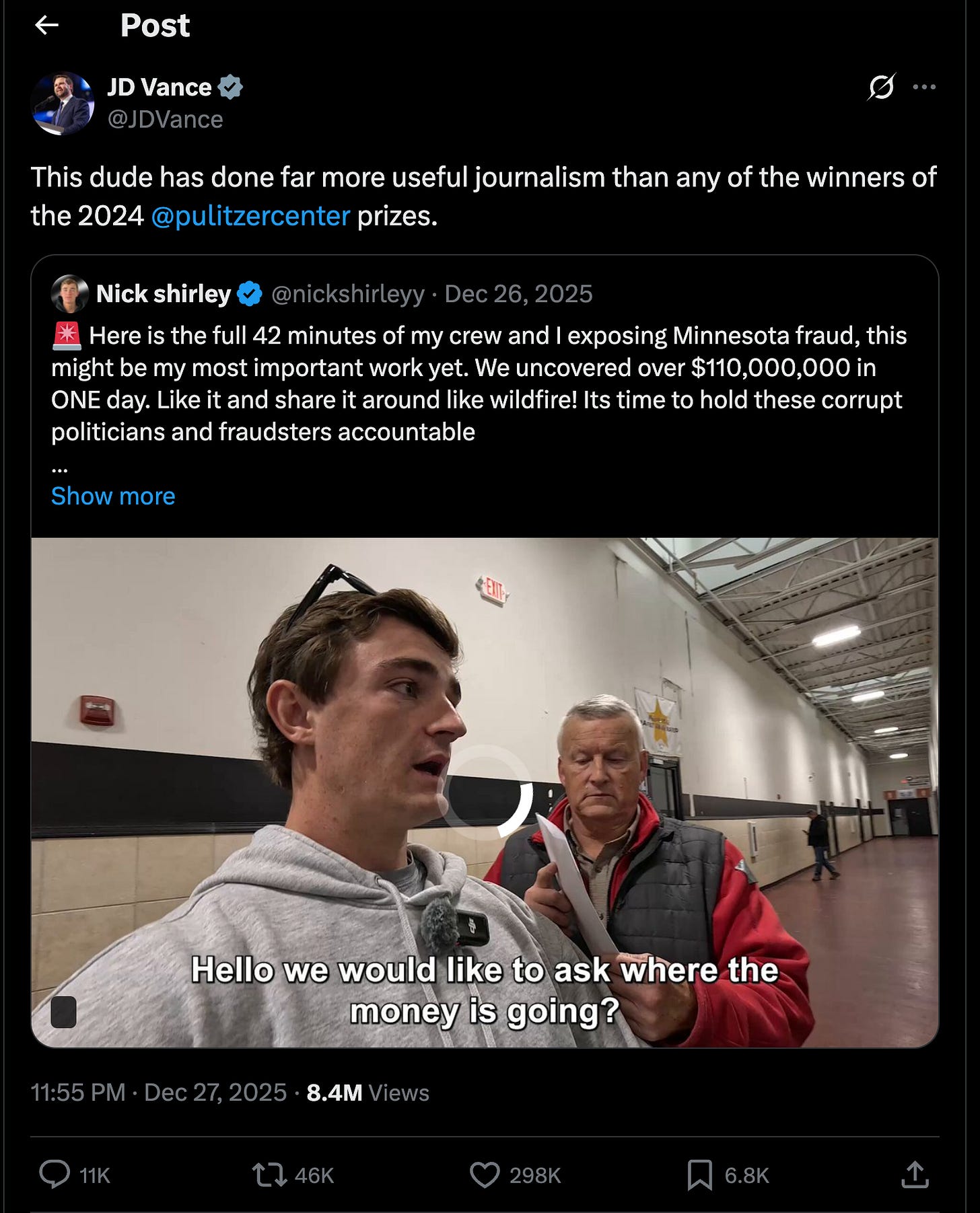 The creator, Nick Shirley, was praised by US Vice President JD Vance, who wrote on X that Shirley had done “far more useful journalism than any of the winners of the 2024 Pulitzer Prizes.”